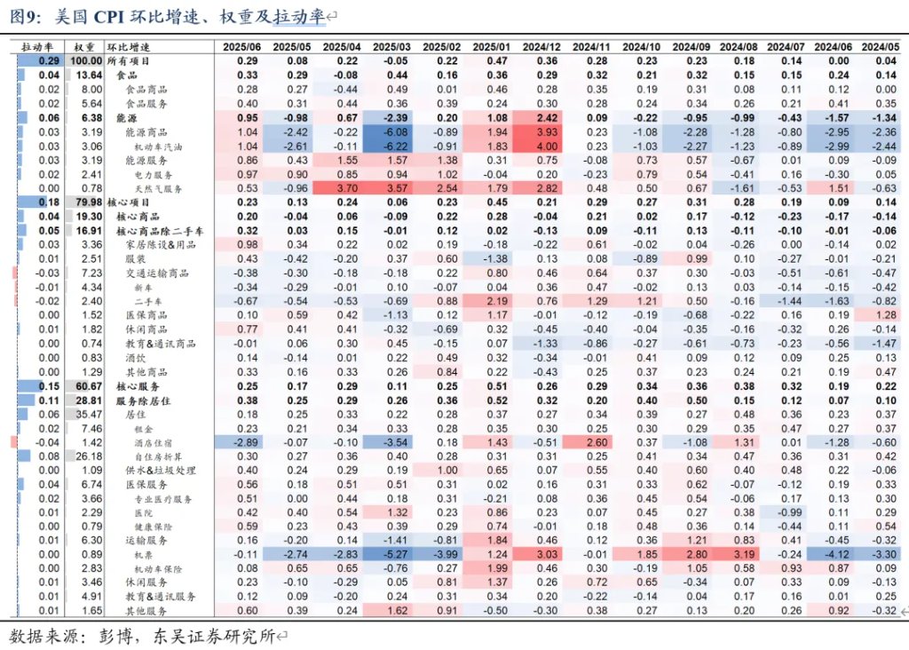 因此,从美国6月CPI数据细节中可看出,关税给核心商品通胀带来的上行压力已部分显露,但由于其在核心商品中的占比不大,因此对总体和核心CPI的贡献度不高。