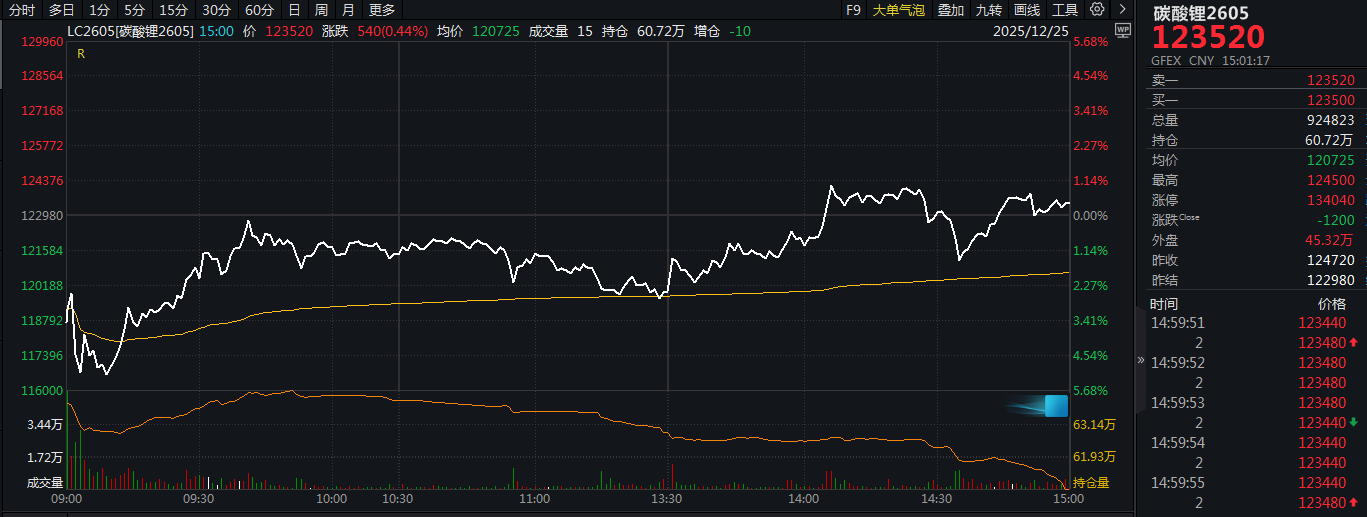 上述背景下,12月25日一早,碳酸锂期货一改前期强势表现,主力LC2605合约盘中跌幅一度超过5%,全天小幅收涨0.44%,并且成交量、持仓量均出现环比下滑。