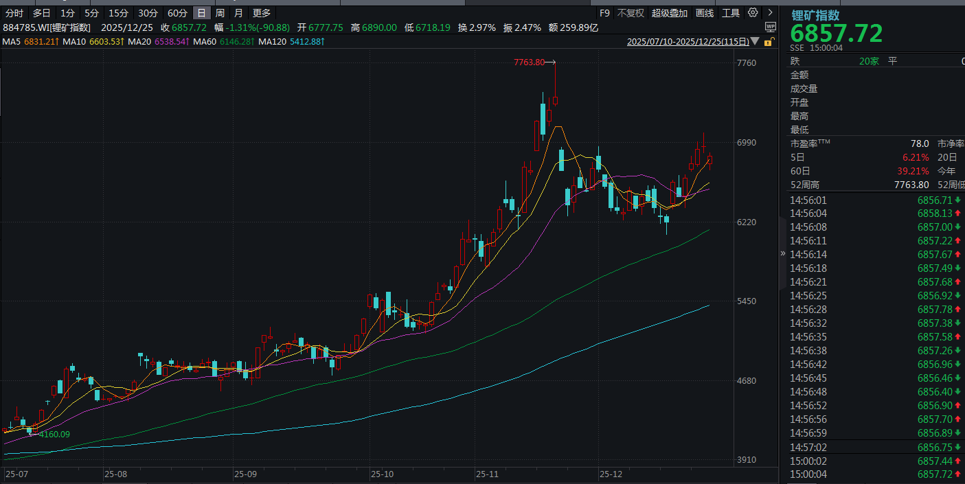 如今,LC2605合约早已将前期10.36万元/吨的高点甩在身后,最高价达到12.79万元/吨;几乎囊括所有锂矿、锂盐行业上市公司的Wind锂矿指数,前期高点为7763.8点,近期亦不过回升至7079.7点附近,出现明显高位滞涨。